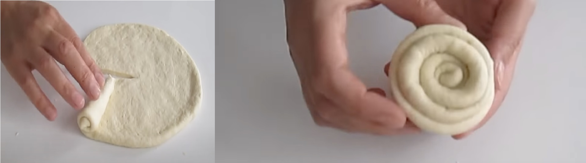 Przygotowane ciasto podzielić na mniejsze części i każdą z nich zwijać w rulon jednocześnie tworząc kształt ślimaka.