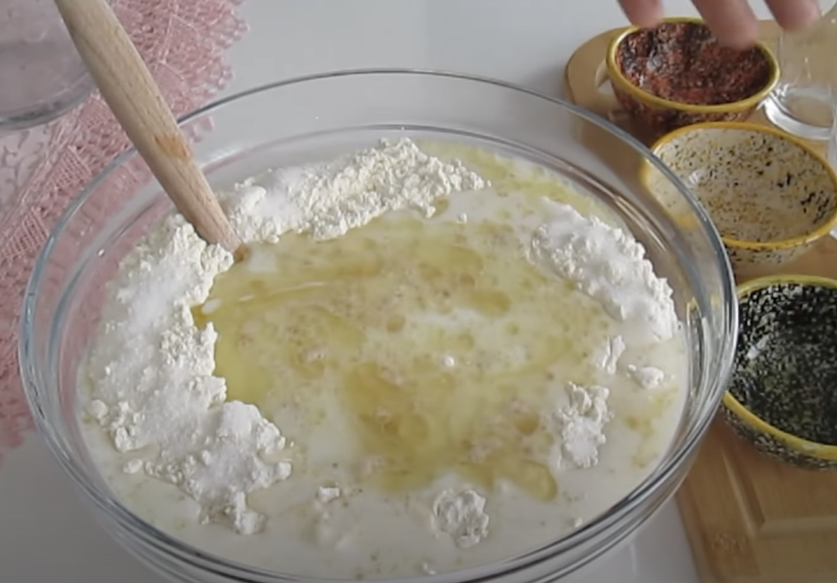 Mąkę przesiać do miski, a następnie dodać do niej drożdże wymieszane wraz z wodą, olejem, mlekiem, solą i pozostałą częścią wody.