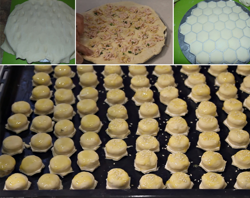 Przygotuj sobie silikonową formę, do pieczenia lub taką do lodu. Ważne, aby posiadała dość małe oczka. Ciasto podziel na cztery kawałki, każdy z nich rozwałkuj tak, by jego grubość wynosiła około 2 – 2,5 cm. Przygotowana formę posyp mąką i przykryj warstwa ciasta. Farsz umieść we wgłębieniach. Przykryj kolejną warstwą ciasta.
