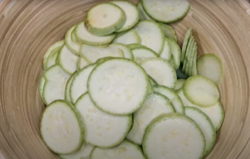 Cukinię pokrój w jak najcieńsze plastry. Warto wybrać warzywo młode, gdyż nie zawiera pestek. Umieść w misce i posól, po czym odstaw na około pół godziny.