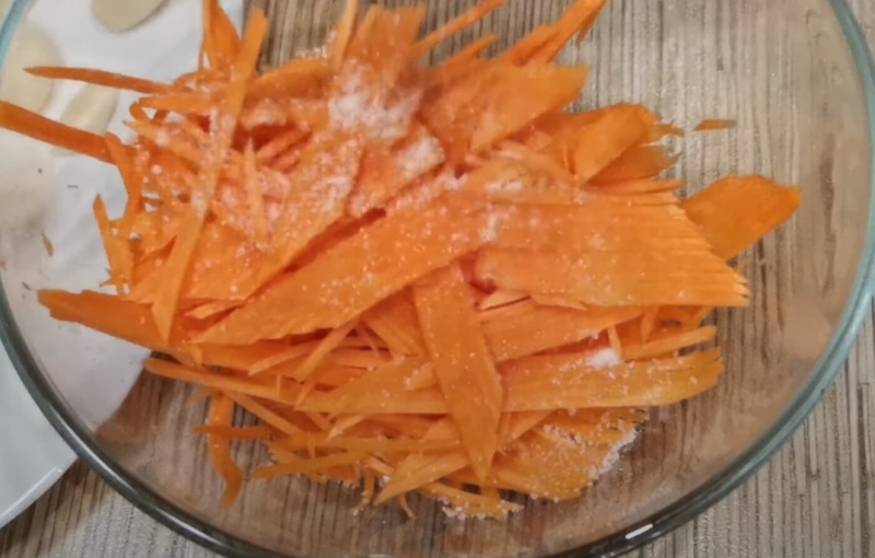 W międzyczasie obierz marchewkę i pokrój ją w paski. Możesz zetrzeć ją na tarce do marchewki po koreańsku, jeżeli taką posiadasz. Umieść w misce, posól szczypta soli i również odstaw na około pół godziny.