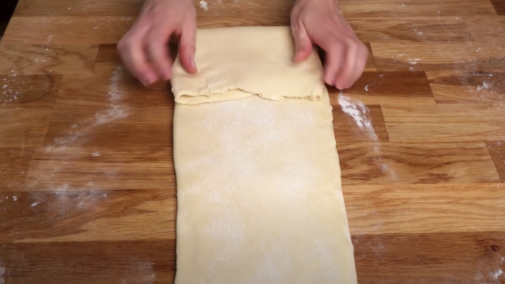 Zwiń brzegi do środka, posyp cukrem (weź połowę) i ponownie rozwałkuj. Ciasto złóż na pół i znów rozwałkuj.