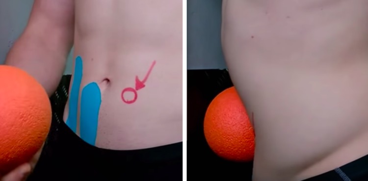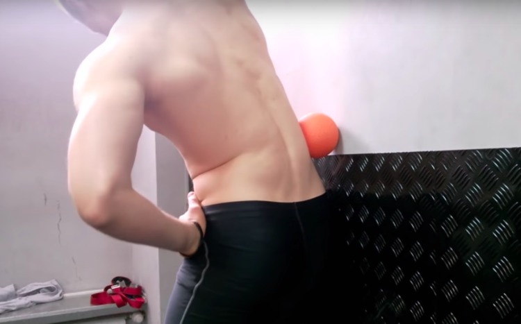 2. Piłkę umieść na wysokości pępka w tylno-bocznej część tułowia (nie celuj w kręgosłup lędźwiowy!).
