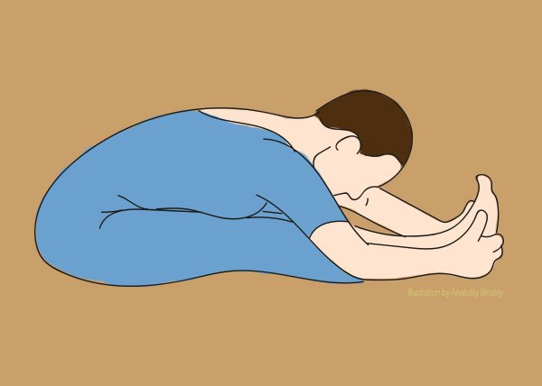 Tym razem stopy wyciągamy przed siebie, dłońmi próbujemy dotknąć palców u stóp, starając się rozciągnąć ciało na wydechu. Wszystko to, aby uzyskać maksymalne napięcie mięśni nóg. To ćwiczenie powtarzamy 5 razy.