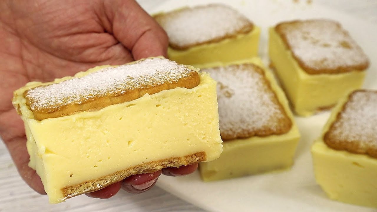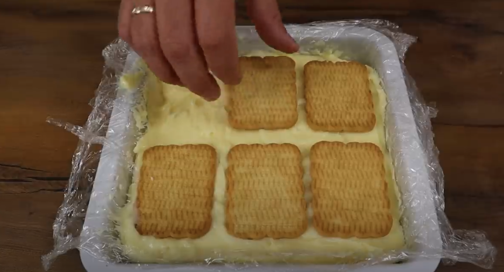 Ostudź krem do temperatury pokojowej. W misce wymieszaj ostudzony krem z serkiem śmietankowym, aż uzyskasz jednolitą masę. Na dnie formy ułóż warstwę biszkoptów. Na biszkopty wyłóż warstwę kremu. Powtórz układanie warstw, aż zużyjesz wszystkie biszkopty i krem. Wstaw deser do lodówki na 2-3 godziny, aby dobrze się schłodził i stężał. Przed podaniem, jeśli chcesz, posyp deser cukrem pudrem dla dekoracji.