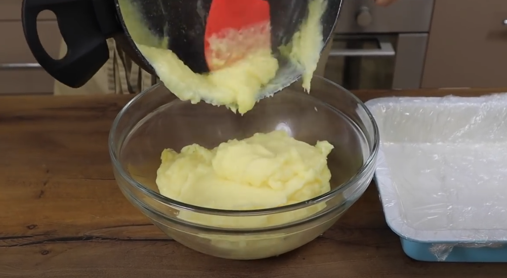 W garnku podgrzej mleko na małym ogniu. Dodaj skrobię kukurydzianą, cukier i wanilię. Mieszaj, aż składniki się rozpuszczą. W osobnej misce roztrzep jajka. Dodaj jajka do garnka z mlekiem, ciągle mieszając, aby uniknąć zważenia się masy. Gotuj na małym ogniu, aż masa zgęstnieje. Pamiętaj, aby cały czas mieszać.