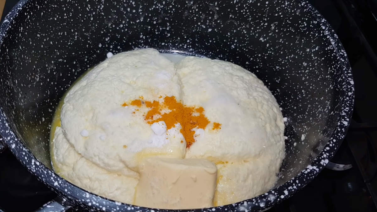 Przygotowany twaróg odcedź za pomocą durszlaka, dobrze odciśnij ser z serwatki. Do twarożku dodaj masło oraz wszystkie sypkie produkty – sodę, kurkumę oraz łyżeczkę soli.
