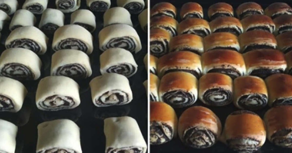 Gdy mak jest gotowy – odlewamy wodę i blendujemy go z chałwą. Przygotowane wcześniej ciasto dzielimy na części i każda z nich rozwałkowujemy na owalny kształt i smarujemy przygotowany nadzieniem. Z każdą częścią postępujemy tak samo . Ciasto zawijamy z ciasny rulon i dzielimy na mniejsze kawałki.