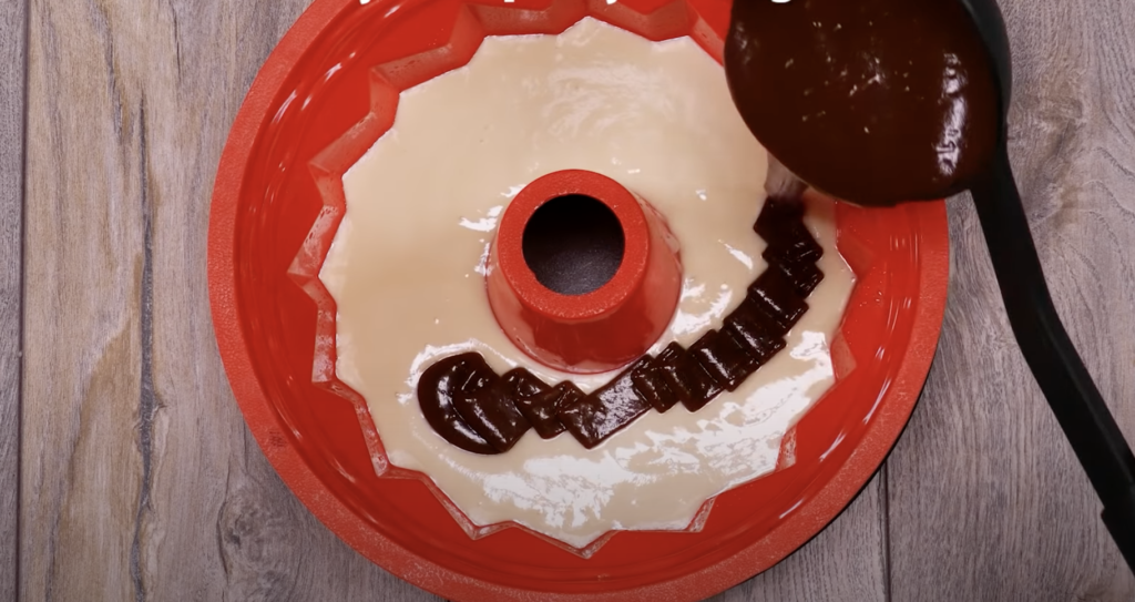 Rozprowadź ciemną masę na wierzchu jasnej części ciasta.