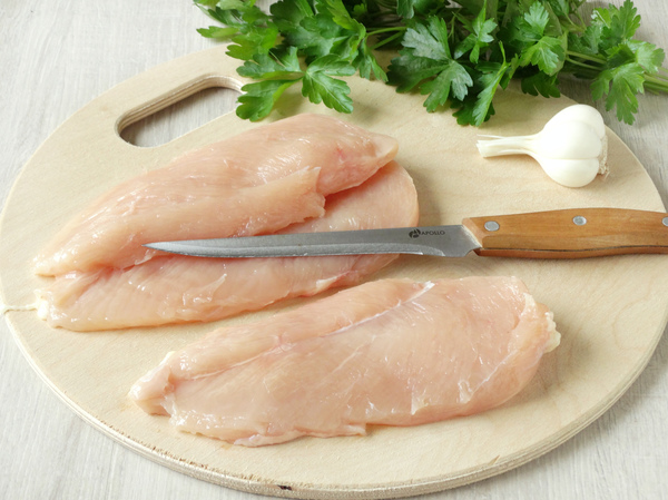 2.Za pomocą ręcznika papierowego osusz umyte piersi z kurczaka. Gdy filety są za grube ,przetnij je cieńsze kotlety.