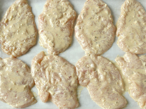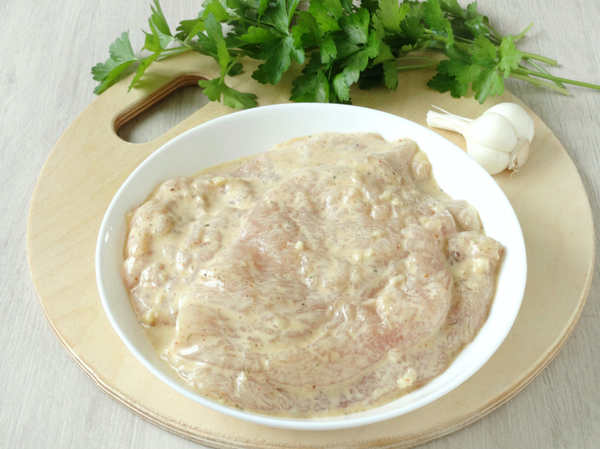 3.Aby mięso się nie rozwalało podczas tłuczenia , połóż na nie folię. Roztłuczone mięso zalej marynatą i odstaw na około 1-2 godziny w chłodnym miejscu.