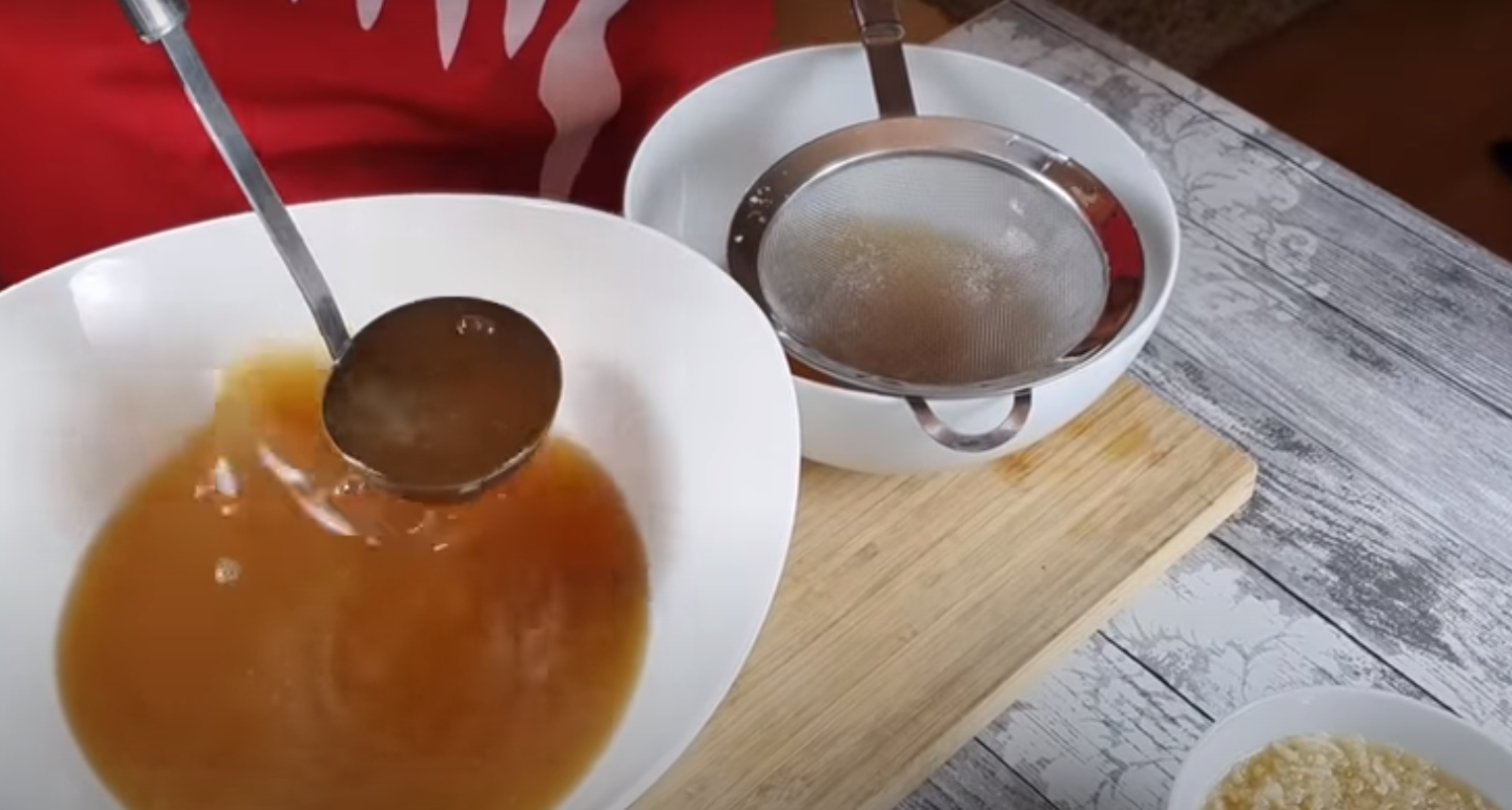 Pozostaw na 5 minut, przecedź pozostały bulion dwa razy. Odcedź czosnek i przelej cały bulion przez sitko z czosnkiem.