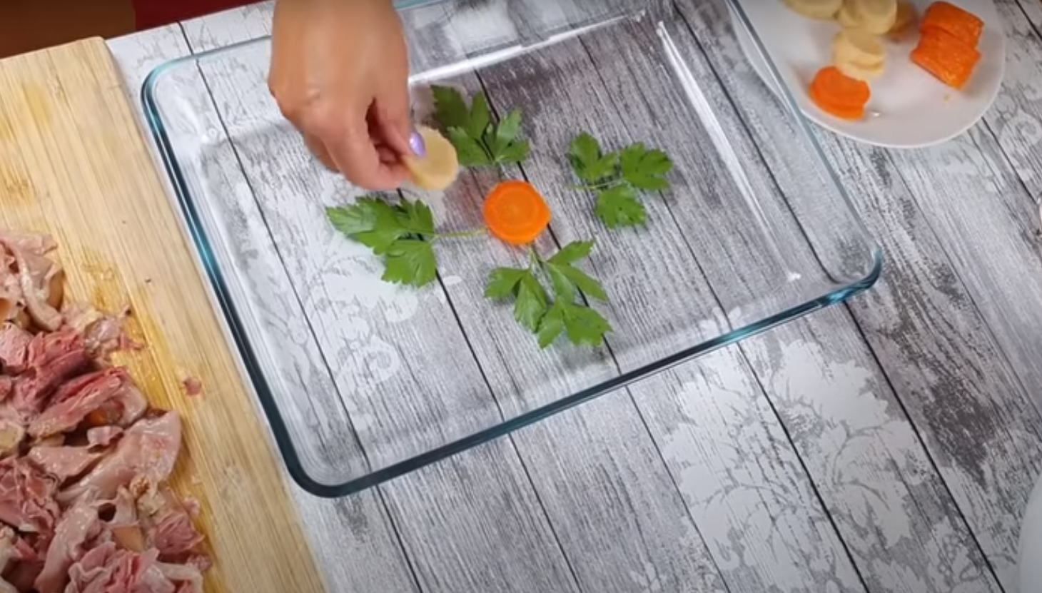 Pokrój mięso na nieduże kawałki. Na dnie szklanego naczynia ułóż umyte liście pietruszki i posiekaną marchewkę, tworząc dowolny wzór.