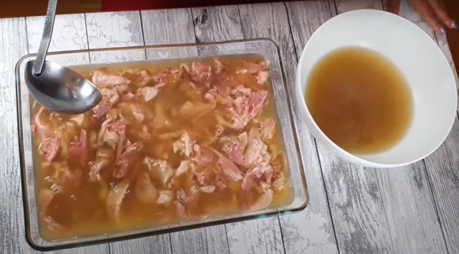 Rozłóż równomiernie mięso, wylej bulion. Wstaw naczynie do lodówki najlepiej na całą noc.