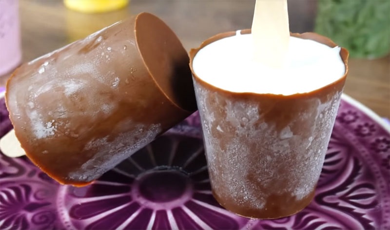 Tak przygotowane kubeczki umieszczamy w zamrażarce na ok. 10 minut, tak, by czekolada zastygła. Po wyjęciu czekoladowych kubeczków z zamrażarki, dokładnie napełniamy je lodową masą i umieszczamy w nich patyczki.
