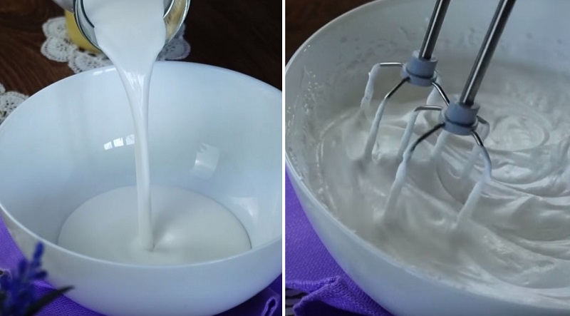 Śmietankę wlewamy do miski i ubijamy mikserem lub trzepaczką do momentu uzyskania gładkiej piany.