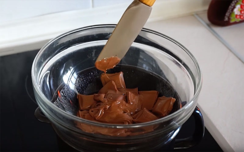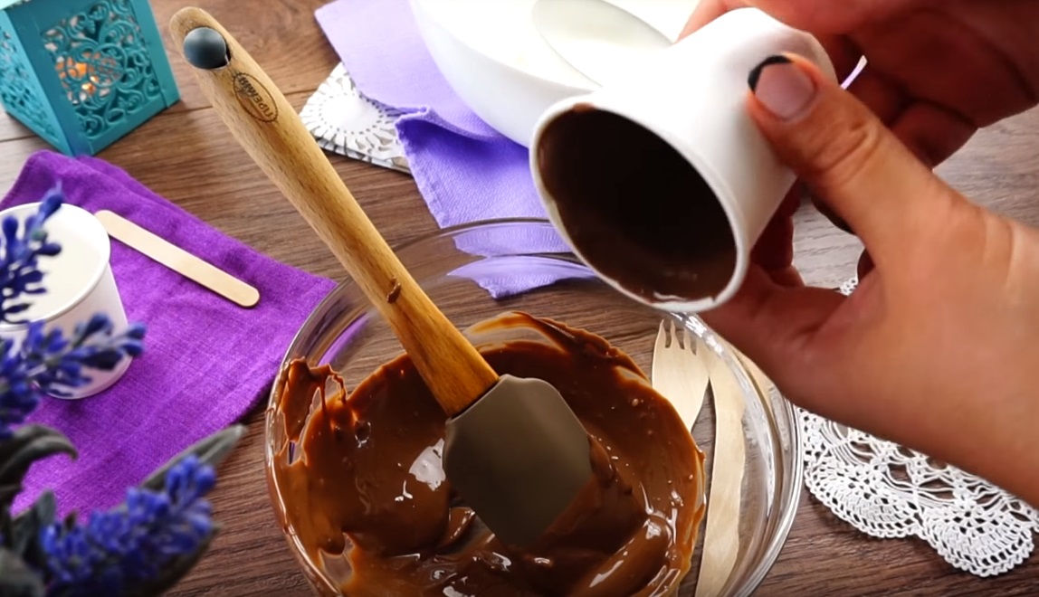 Czekoladę rozpuszczamy w kąpieli  wodnej. Następnie ostrożnie wylewamy ją na dno i ścianki plastikowych kubeczków, tworząc cienką warstwę.