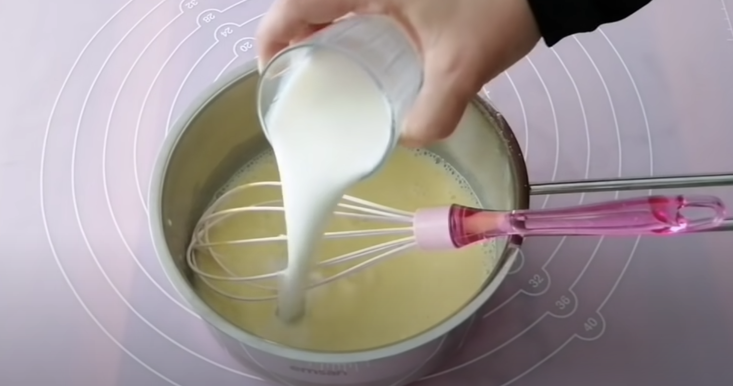 Przygotowanie ciasta zaczynamy od zrobienia kremu. W niewielkiej ilości mleka mieszamy jajka, skrobię i cukier.