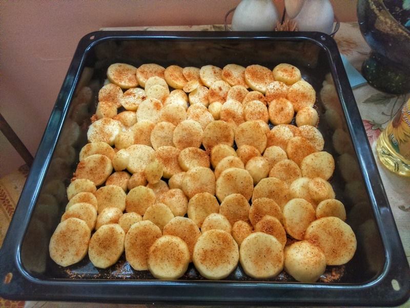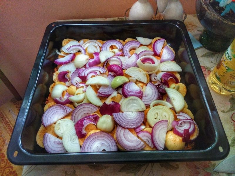 Pokrój cebulę w piórka i boczek w kostkę. Połóż je na ziemniakach.