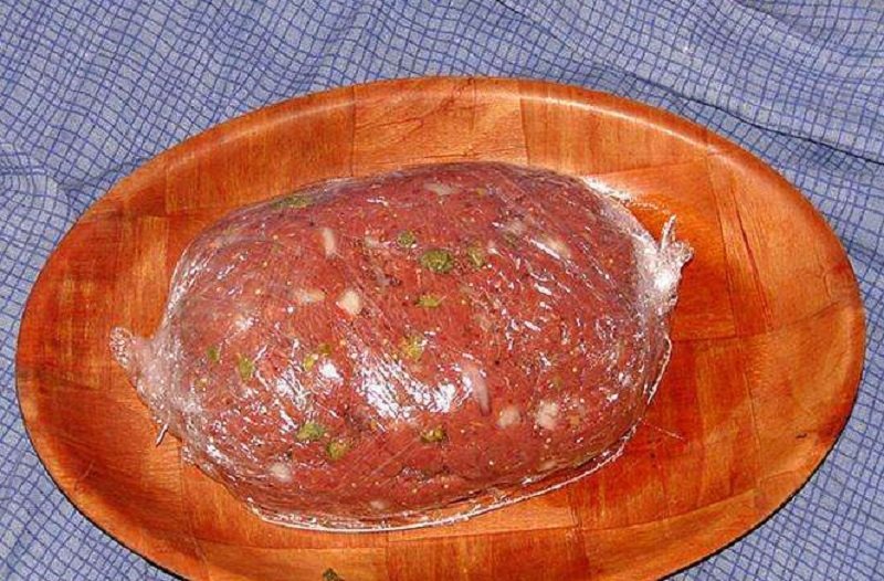 Aby uniknąć przyklejania się mięsa do rąk, powoli, cały czas ugniatając wlewaj do niego wodę i ugniataj lub mieszaj przez kolejne 10 minut. Następnie dodaj oliwę z oliwek i mieszaj jeszcze przez ok. 5 minut. Tak przygotowany mięsny farsz włóż do rękawa do pieczenia lub do torebki foliowej i umieść w lodówce na jeden dzień.