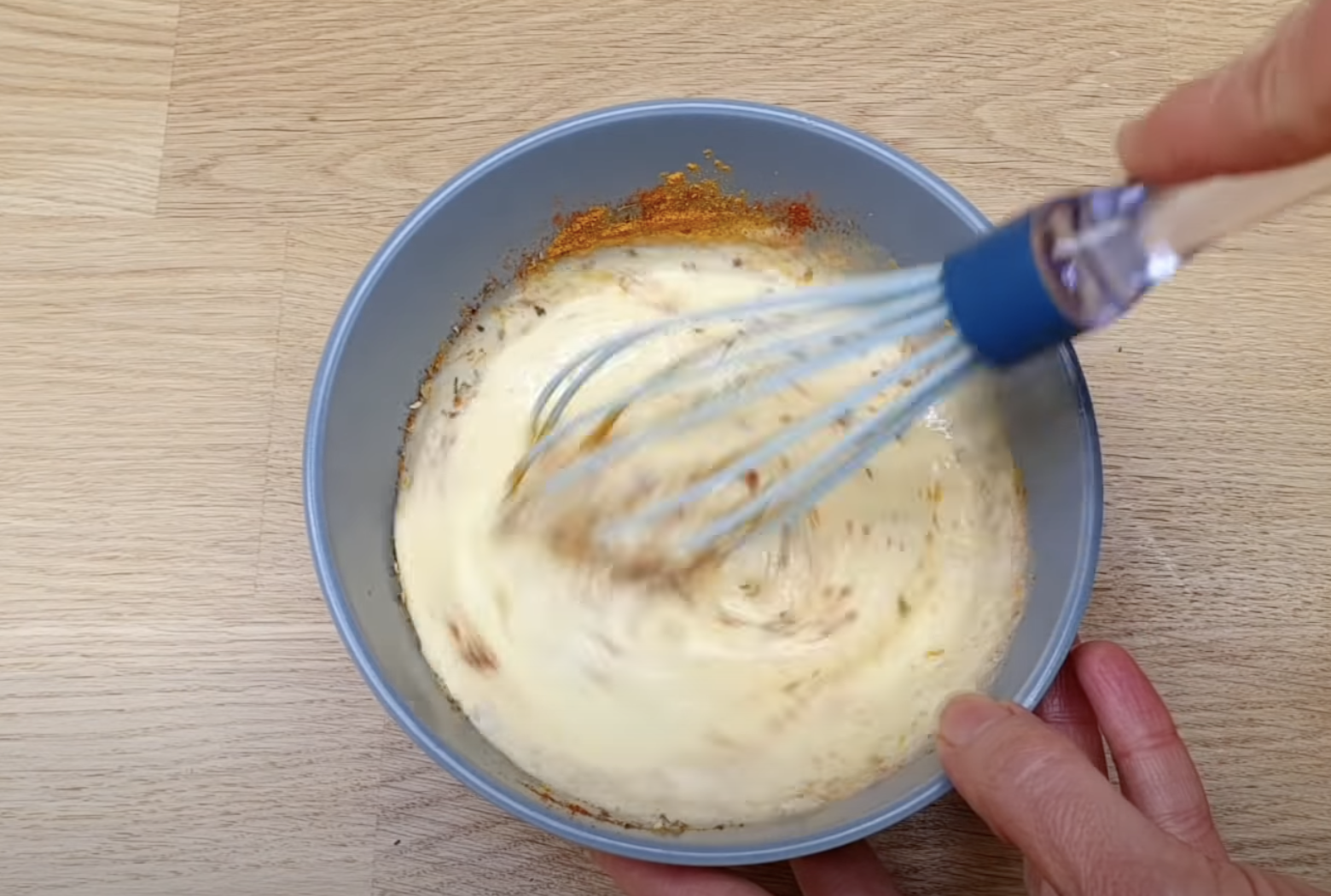 Śmietankę wymieszaj z posiekanym czosnkiem, przyprawą do gyrosa i łyżką ulubionej musztardy. Tak przygotowanym sosem zalej mięso, przykryj naczynie folią spożywczą i wstaw do nagrzanego do 180 stopni piekarnika.