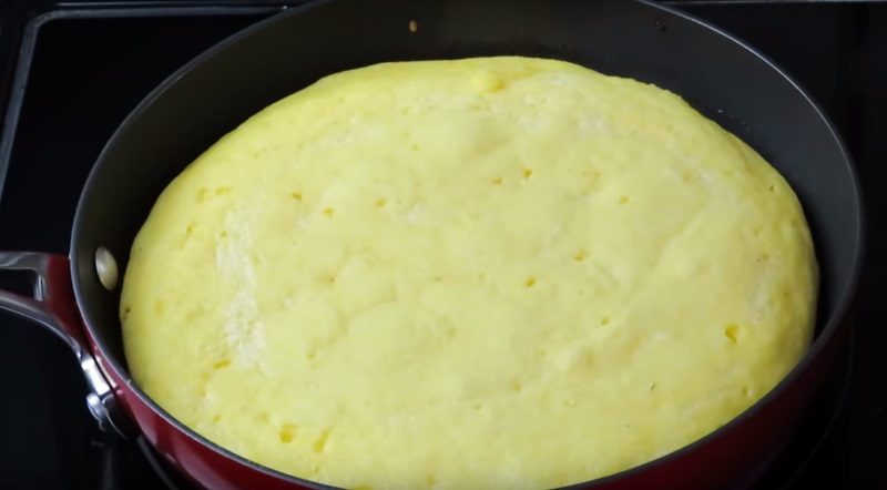 Na rozgrzaną patelni usmaż ciasto, do uzyskania złotego koloru na średnim ogniu, przez 5 minut. Na koniec obróć ciasto i smaż jeszcze przez 3 minuty.