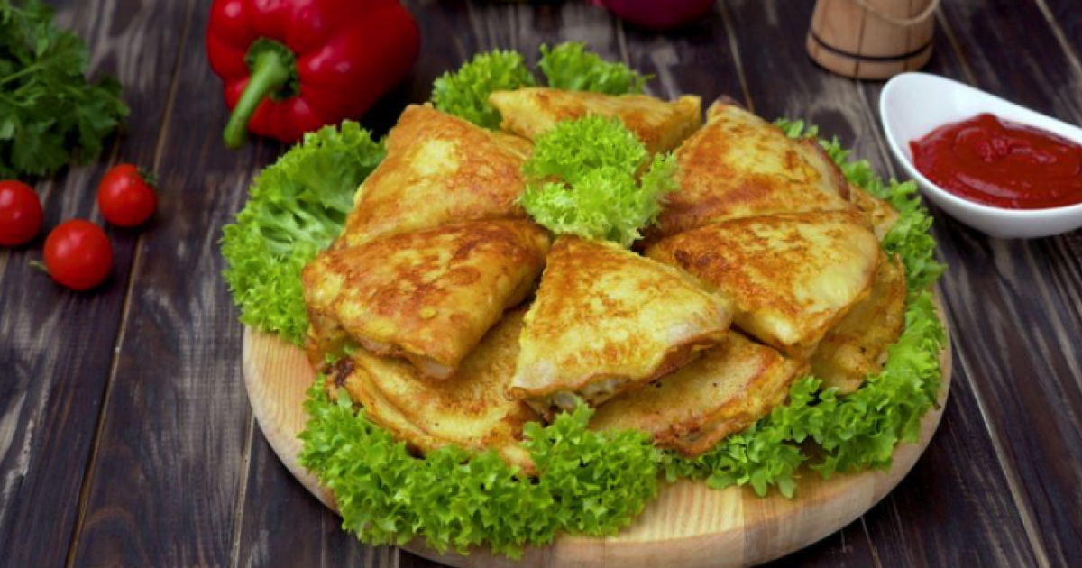 Dodając do tego 100 ml mleka. Razem z przyprawami wymieszać. Naleśniki należy przeciąć na pół, rozłożyć warstwę farszu i formować z tego trójkąty.