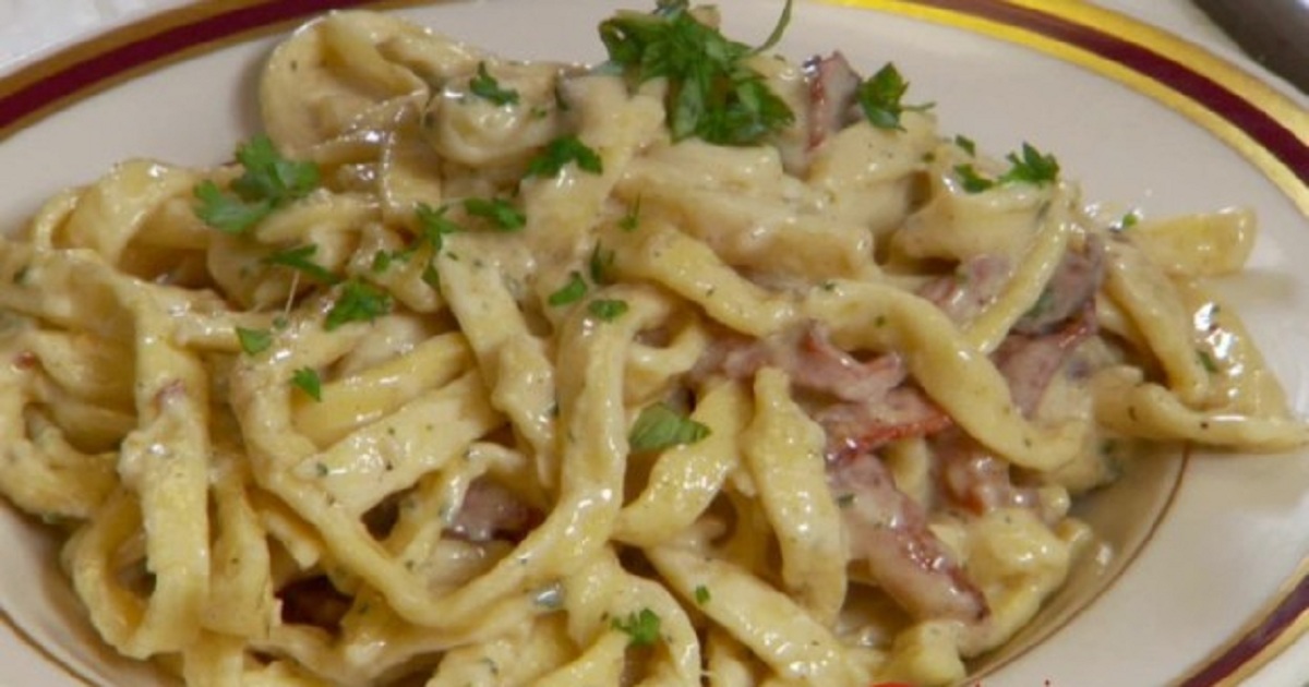 Wśród składników wyróżnia się przede wszystkim: 500 gram makaronu spaghetti, 150 gram boczku albo szynki, jeden ząbek czosnku i jedna szklanka kwaśnej śmietany, a także 100 gram sera topionego, oraz gałka muszkatołowa, sól, pieprz i oregano, wraz z dwoma kawałkami dobrze posiekanej cebuli.