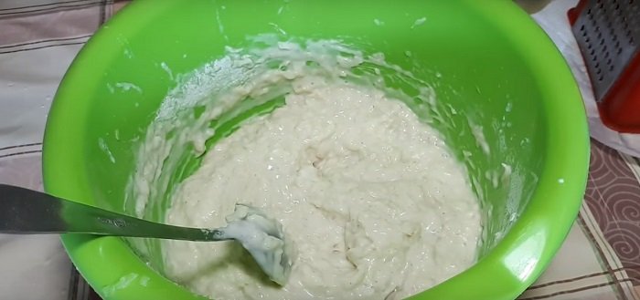 Po wymieszaniu dodać również jajko, kefir, proszek do pieczenia i mąkę. Wszystkie składniki razem połączyć aż do uzyskania gęstej i jednolitej konsystencji.