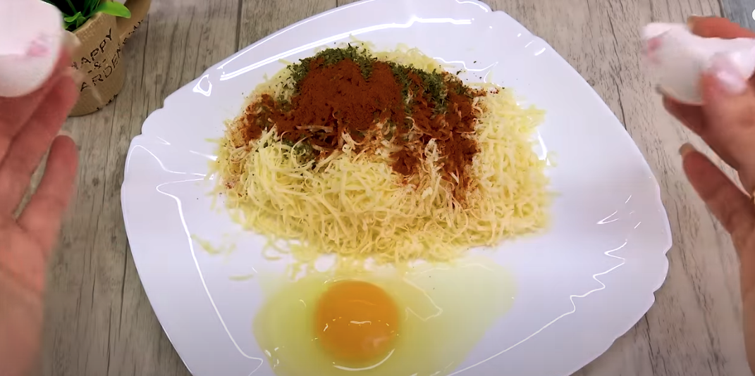 Zrób małe rowki widelcem na 2 cukiniach. Pokrój cukinie na plasterki. Posól i dopraw czarnym pieprzem. Dokładnie wymieszaj i odstaw na 15-20 minut. W międzyczasie przygotuj pozostałe składniki: Zetrzyj 100 g sera. Dodaj 1 łyżeczkę suszonej pietruszki. Dodaj 1 łyżeczkę papryki. Wbij 3 jajka i dobrze wymieszaj.