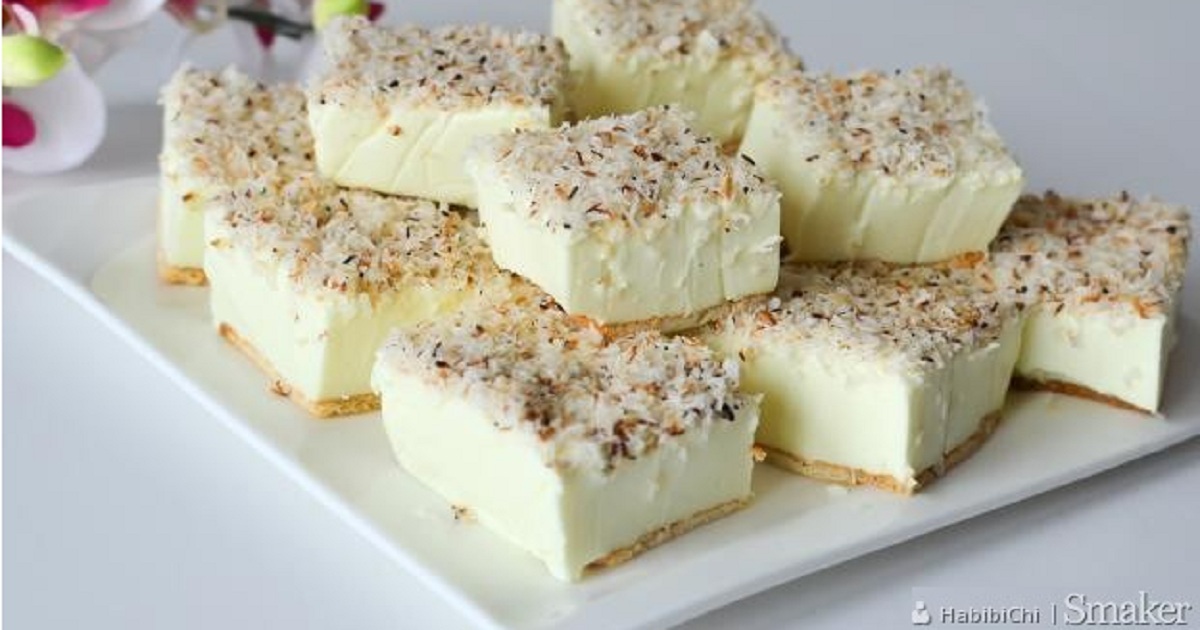 Na dnie blachy muszą zostać położone herbatniki, na nie ma być wlana masa, a wierzch posypany wiórkami kokosowymi. Całość powinna zostać wstawiona do chłodziarki na noc.