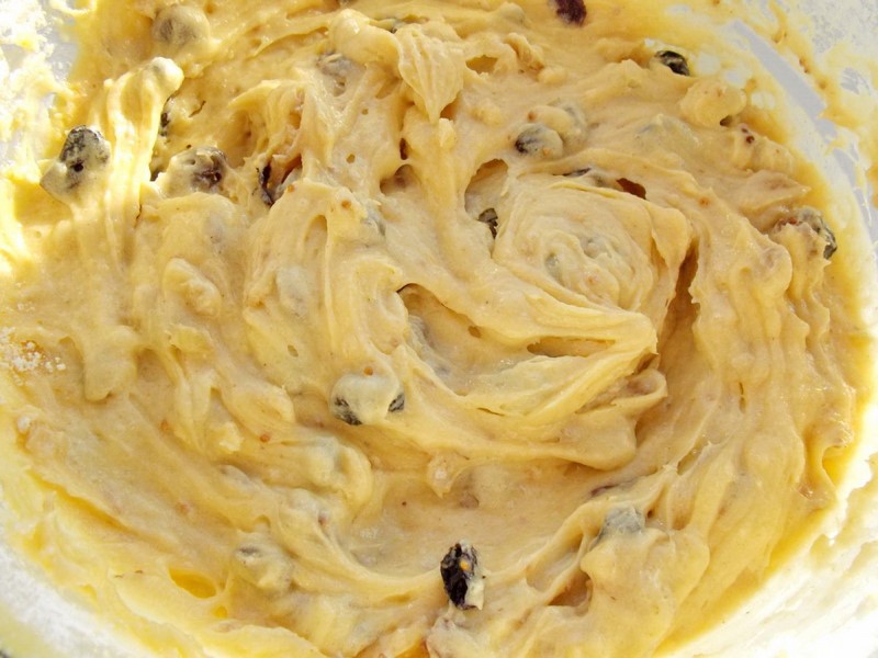 Następnie powoli dodaj mąkę, cały czas mieszając ręcznie lub na najniższych obrotach miksera. Na koniec dodaj rodzynki i proszek do pieczenia. Zamieszaj i ciasto jest gotowe do pieczenia.