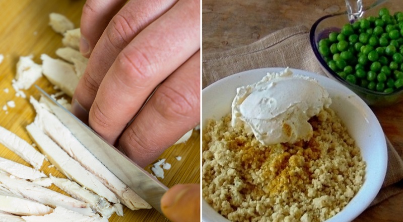 Weź ugotowaną pierś z kurczaka i pokrój ją w małe kawałki. Wrzuć ją do miski, dodaj przygotowany serek śmietankowy, zielony groszek i przyprawy.