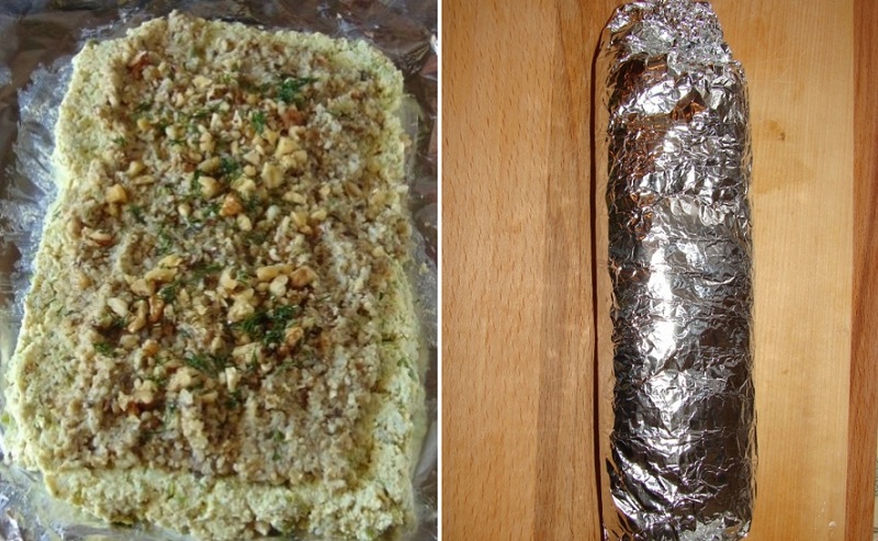 Całość posyp posiekanymi orzechami i świeżym koperkiem. Zwiń roladę wraz z folią i wstaw ją do lodówki na 60 minut. Po wyjęciu możesz udekorować danie ziołami lub suszoną żurawiną.