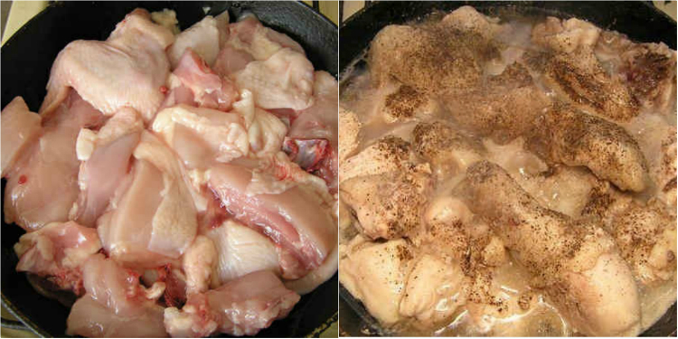1. Mięso należy pokroić na średniej wielkości kawałki. Umieścić na patelni żeliwnej bądź o grubym dnie, bez dodawania oleju. Dusić pod przykryciem przez 35-45 minut, z dodatkiem soli i innych przypraw.