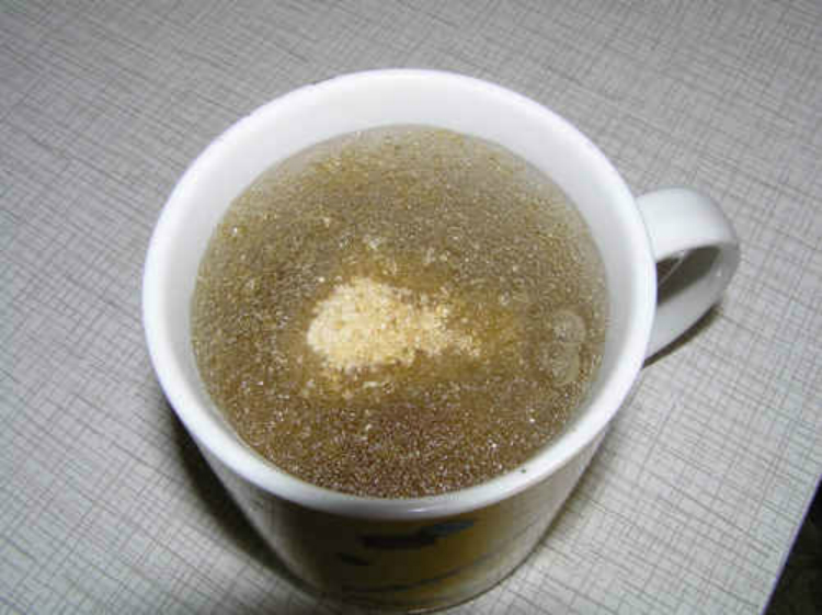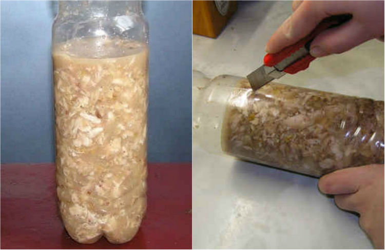 6. Teraz należy sięgnąć po czystą, plastikową butelkę. Należy odciąć butelce szyjkę i wypełnić ją całkowicie schłodzoną mieszanką. Włożyć do lodówki na kilka godzin, aż do pełnego stężenia potrawy. Wyjmować poprzez ostrożne rozcięcie butelki.