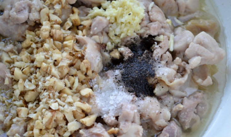5. Orzechy i czosnek przecisnąć przez praskę i dorzucić do mięsa. Dodać sól i pozostałe przyprawy, następnie należy zalać mięso bulionem przygotowanym z żelatyną.