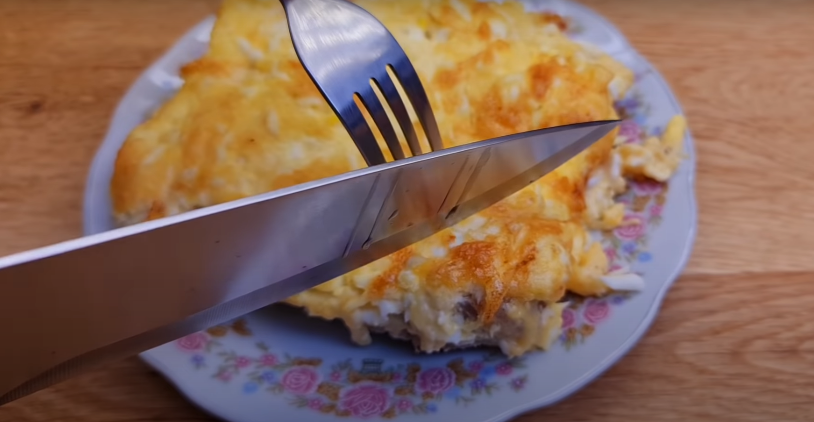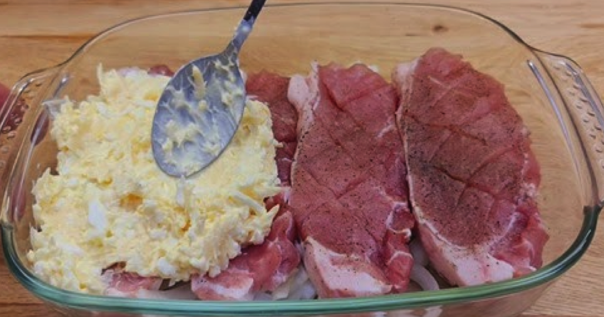 Na jego dno wsypujemy pokrojoną cebulę. Na nią układamy ponacinane mięso. Teraz smarujemy mięso wcześniej przygotowaną masą z jajek i sera.