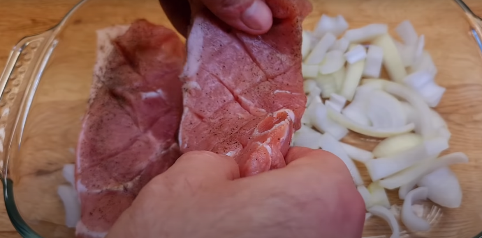 Cebulę kroimy w piórka. Plastry schabu nacinamy na wzór siatki i przyprawiamy z obu stron według uznania. Teraz przygotowujemy naczynie żaroodporne.