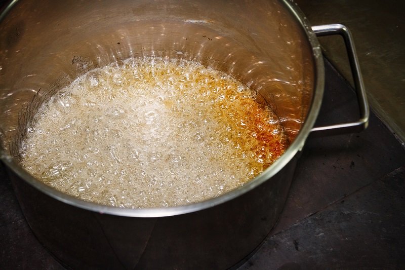 Następnie wsyp cukier do garnka, dodaj wodę. Gotuj, mieszając od czasu do czasu, aż do rozpuszczenia cukru. Do wrzącej wody wrzuć owoce, zmniejsz ogień i gotuj tak przez pół godziny. Po tym czasie wyciągnij śliwki z syropu.