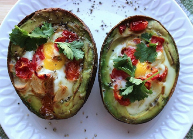 Rozgrzej piekarnik do 200 °C. Przetnij awokado na pół, a następnie usuń z niego pestkę wraz z odrobiną miąższu. Wbij w przygotowane w ten sposób zagłębienie jajko, a do smaku dodaj pomidory, sól, pieprz oraz pietruszkę. Piecz przez 20-22 minut.