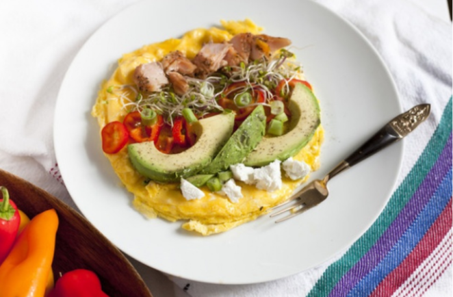 Aby zjeść obfite i bogate w białko śniadanie, możesz dodać awokado i kawałki łososia do puszystego omletu.
