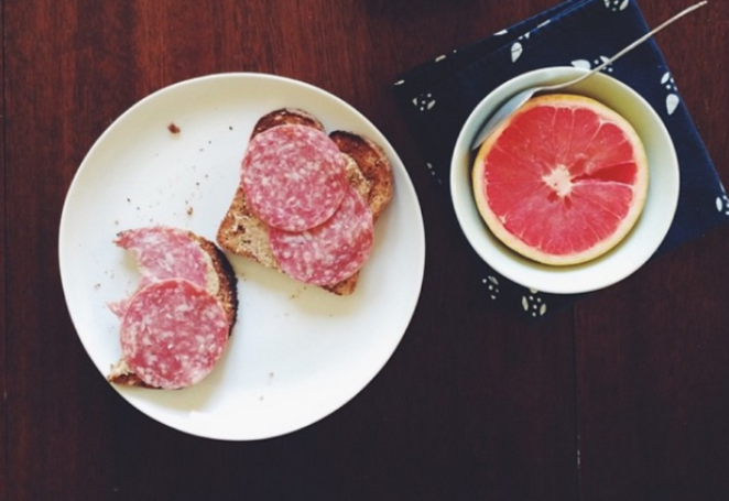 2. Owoce i tosty z masłem migdałowym oraz salami