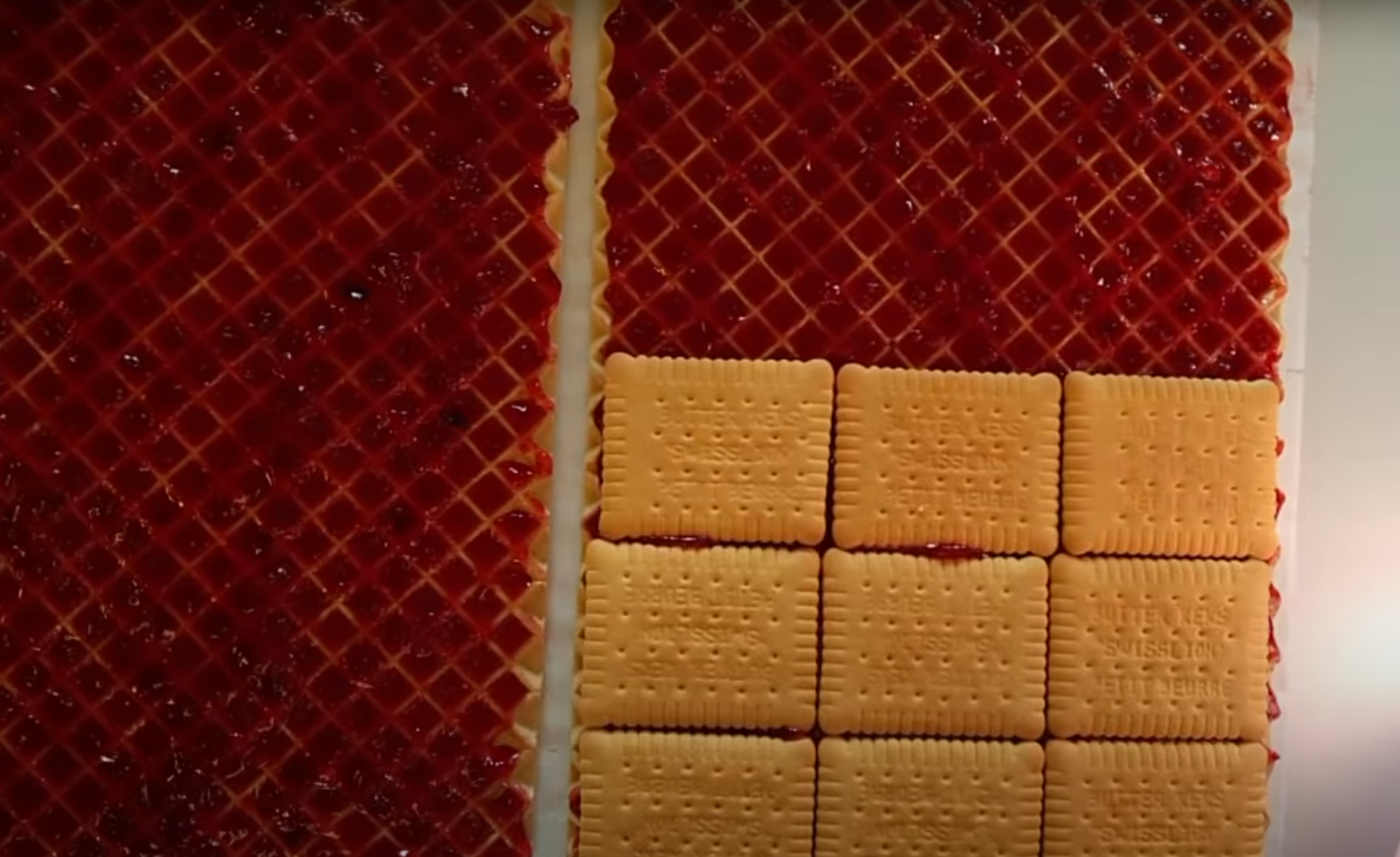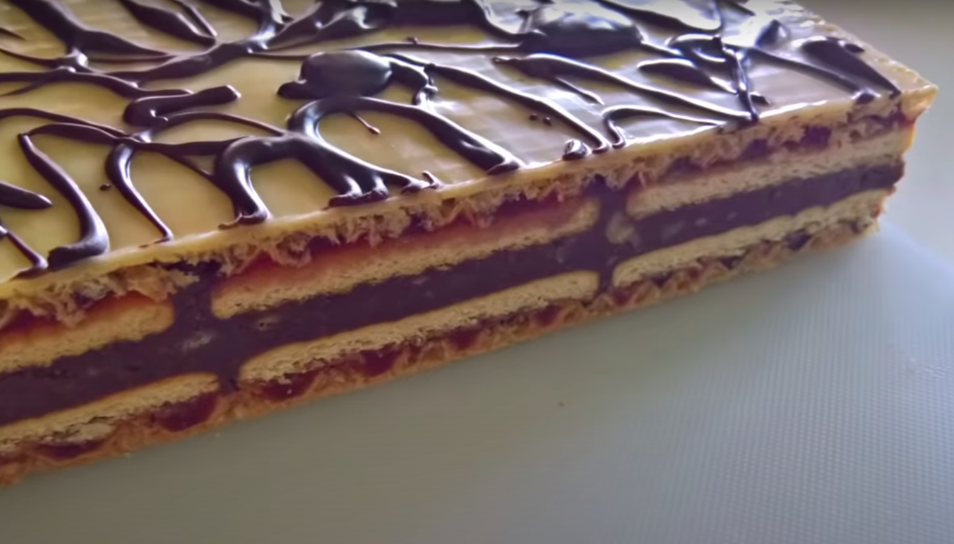 Gotową masę rozsmarowujemy na herbatnikach, a następnie układamy kolejną warstwę takich samych herbatników. Na koniec przykrywamy wszystko drugim waflem posmarowanym dżemem.