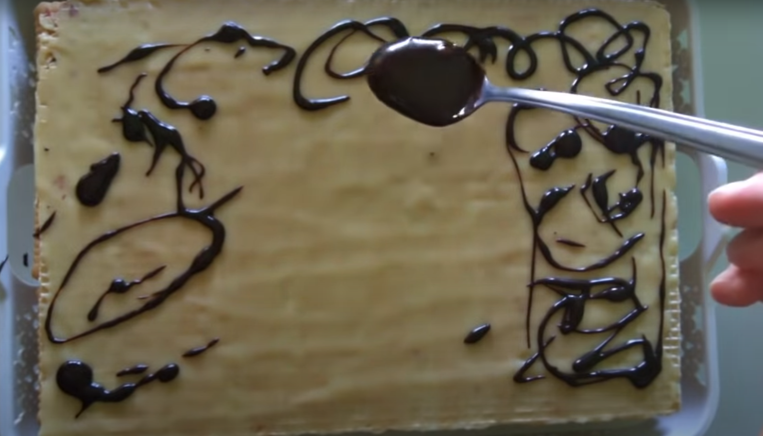 Na koniec rozpuszczamy gorzką czekoladę wraz z bitą śmietaną i dekorujemy nią wierzch deseru.