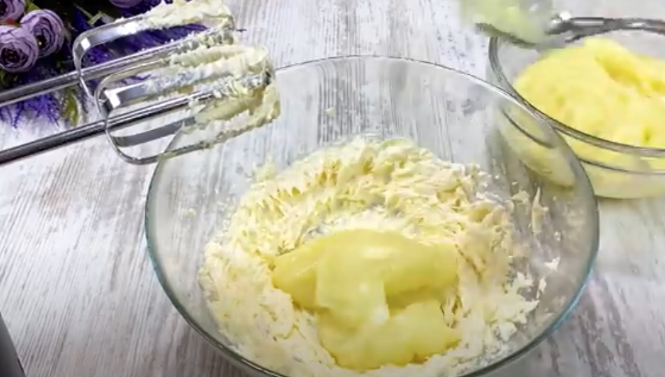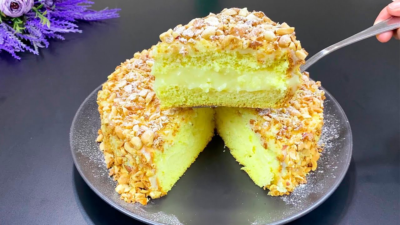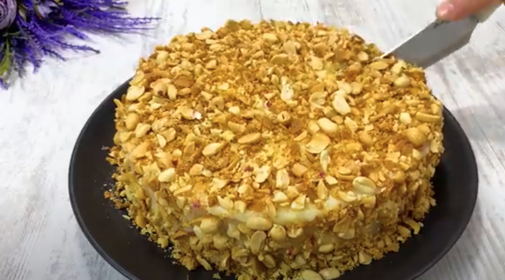 Dodaj 400 g mleka, 2 łyżki skrobi i wanilinę (opcjonalnie). Gotuj na średnim ogniu, ciągle mieszając, aż masa zgęstnieje. Pozostaw do ostygnięcia. Odciąć górną część ciasta. Przekroić ciasto na pół. Posiekaj 100 g dowolnych orzechów. Wymieszaj posiekane orzechy z 100 g masła i schłodzoną śmietaną. Namocz ciasto wodą, cukrem i rumem do smaku. Rozsmaruj krem na dolnej połowie ciasta. Nałóż drugą połowę ciasta i rozsmaruj pozostały krem na wierzchu. Umieść górną część ciasta na wierzchu.