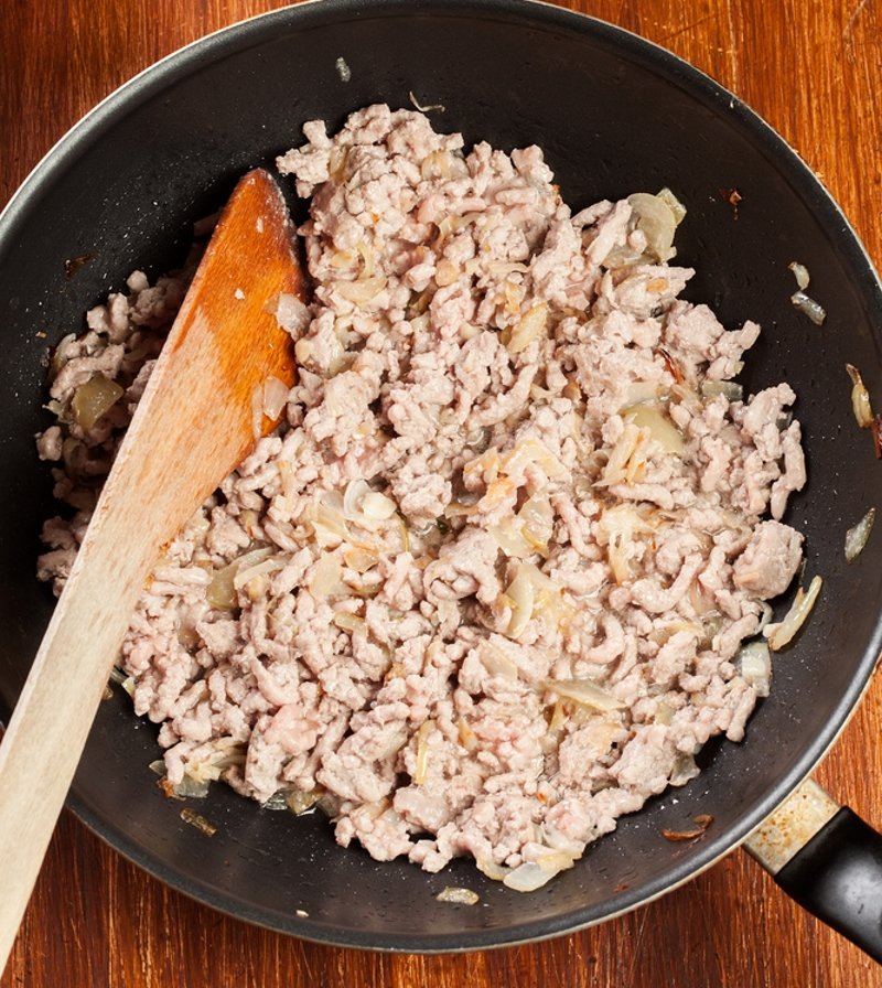 Na patelni podsmaż na oleju cebulę, gdy się zeszkli dodaj mielone mięso i smaż na małym ogniu. Obrane ziemniaki zetrzyj na tarce o grubych oczkach i dodaj do na wpół gotowego mięsa.