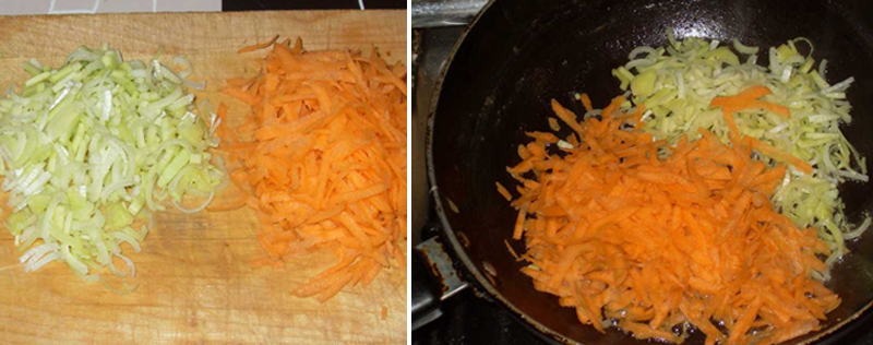 Pierwszym krokiem jest umycie i obranie cebuli oraz marchewki. Następnym krokiem jest potarcie ich na grubej tarce i dołożenie do tego ziemniaków pokrojonych w kostkę. Kolejno gotujemy jajka na twardo. Warzywa smażymy delikatnie na maśle.
