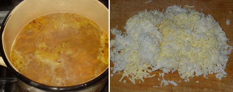 W momencie gdy marchewka jest miękka, a cebula przezroczysta wówczas kończymy smażenie. Bierzemy litr bulionu i go zagotowujemy i do niego dodajemy ziemniaki oraz groszek wraz z zalewą. Całość gotujemy do momentu aż ziemniaki będą miękkie, a do tego dodajemy wcześniej usmażona warzywa oraz ugotowane i starte jajka.